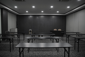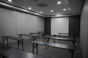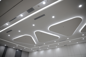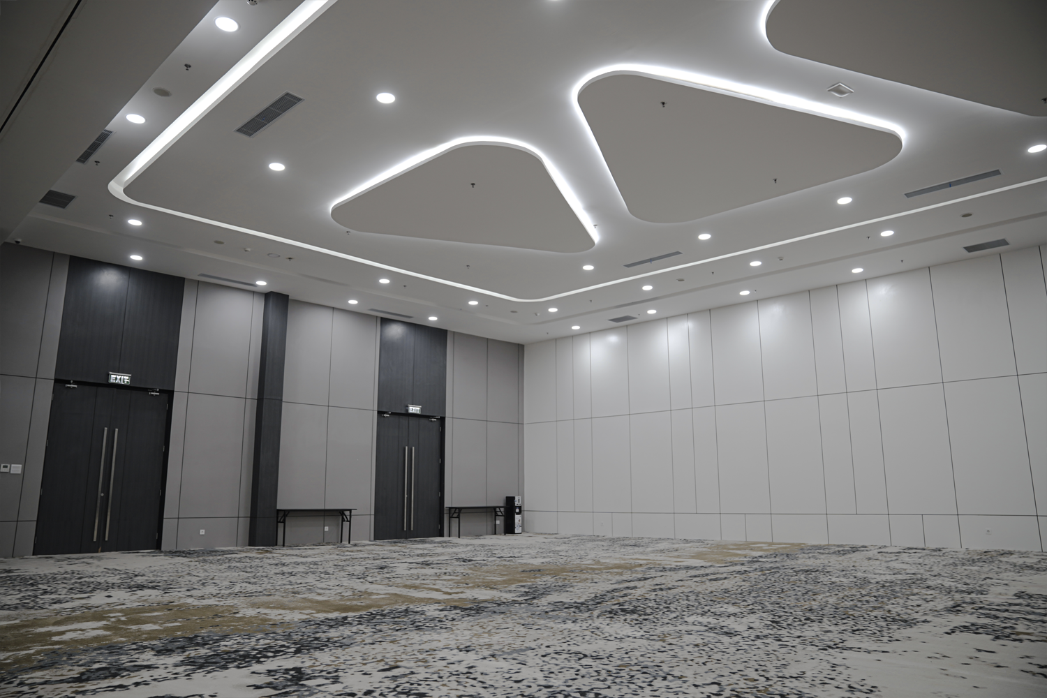 The bright lighting in the room and the use of geometrical designs on the ceiling give the ballroom a broad impression. The room looks more attractive and suitable for various formal/informal events